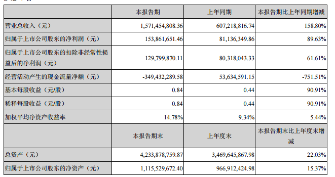 今日電池雜志-中國電池聯盟訊(李冰 北京報道)8月23日,蘇州中來光伏新材股份有限公司(以下簡稱“公司”)發布公告,公告稱,報告期內,公司營業收入15.7億元,同比增長158.80%;實現歸母凈利潤1.54億元,同比增長89.63%;實現扣非歸母凈利潤1.30億元,同比增長61.61%。