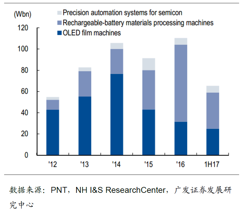 韓國以及全球新能源汽車的發(fā)展帶動了韓國三星SDI、LG化學等動力電池企業(yè)的繁榮,作為三星SDI、LG化學等優(yōu)質(zhì)動力電池企業(yè)鋰電設備的供貨商,PNT鋰電設備業(yè)務營業(yè)收入快速增長。從PNT營業(yè)收入的地區(qū)分布來看,中國市場對業(yè)績的貢獻逐年增大,并在2016年首次超過韓國本土。受益新能源汽車中國市場的發(fā)展,2017年上半年,PNT中國市場的營收占比進一步擴大,達到了61.9%。