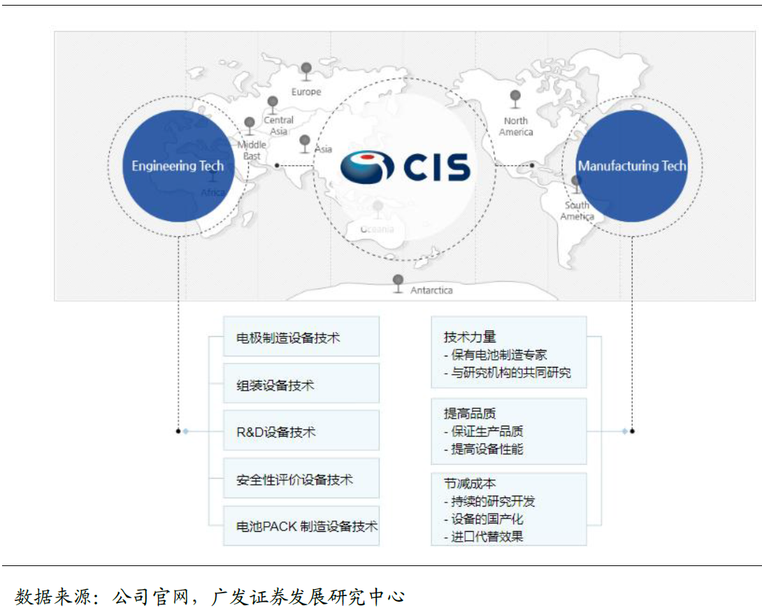 CIS成立于2002年的韓國公司。其主營業(yè)務為生產(chǎn)、銷售鋰離子電池制造設備、燃料電池制造設備、太陽能電池制造設備以及顯示器制造設備。CIS公司是鋰電設備的集大成者,生產(chǎn)從極片制作、電池單元(電芯)制作和電池組裝各個工段所需要的各種設備,并且在技術上具備一定的優(yōu)勢。2015年6月,浩能科技與CIS合資創(chuàng)辦了智慧易德,并將其打造成浩能科技和CIS進行技術和市場合作的中間業(yè)務平臺。