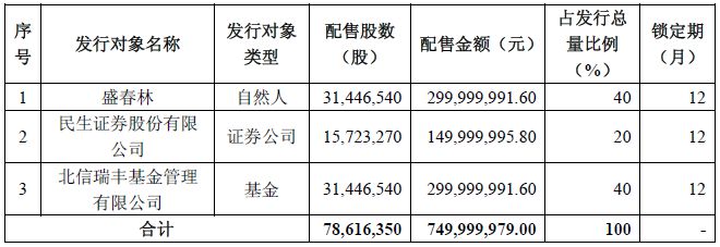 本次發行不涉及購買資產或者以資產支付,認購款項全部以現金認購,3名發行對象已將認購資金全額匯入指定的資金交收賬戶。各發行對象獲得配售的情況如下: