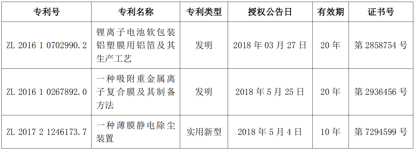 電池軟包裝鋁塑膜產品上,其熱封強度、漲破強度、層間強度、電解液耐受性、冷沖深完全滿足鋰離子電池使用性能要求,系公司開發的鋁箔新產品,目前已完成技術驗證,開始供應日本、歐洲客戶使用。發明專利“一種吸附重金屬離子復合膜及其制備方法”是一種石墨烯涂布高分子膜的工藝,用于高效治理水體重金屬離子,作為公司未來的技術儲備。實用新型專利“一種薄膜靜電除塵裝置”已應用于紙包裝材料產品的生產工藝中。