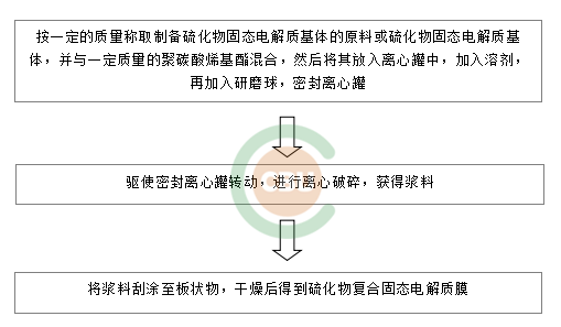 然而,研究發現,硫和聚醚類的醚氧鍵發生反應,導致硫或硫化物在聚醚類的聚合物中發生溶解現象,從而會在硫化物復合電解質制備成膜時,產生雜相,導致離子電導率降低。為了解決現有技術的硫化物復合固態電解質中,硫或硫化物在聚醚類的聚合物中發生溶解現象,而在硫化物復合固態電解質制備成膜時,產生雜相,導致離子電導率降低的技術問題,桑德集團發明了一種硫化物復合固態電解質,通過聚碳酸烯基酯與制備硫化物固態電解質基體的原料制備而成、或通過聚碳酸烯基酯與硫化物固態電解質基體制備,從而解決上述導致離子電導率降低現象。