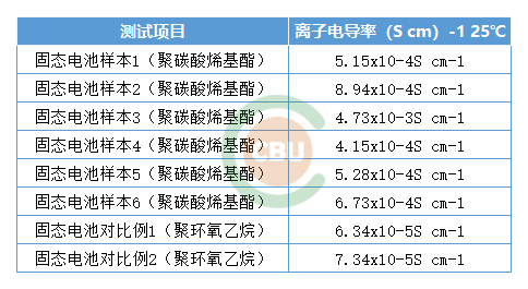 通過對比樣本與對比例數據,可以看出,采用聚碳酸烯基酯制備得到的硫化物復合固態電解質膜的離子電導率,均比采用聚環氧乙烷制備得到的硫化物復合固態電解質膜離子電導率高,甚至提高了一個數量級。