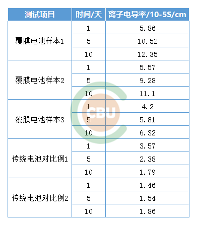 測試數據:在60℃下,分別對覆有Li3PO4/LATP的金屬鋰片制成的固態電池與傳統鋰片電池在不同時間下的阻抗進行測試,測試結果如下表,顯示出添加Li3PO4/LATP膜層后的固態電池鋰離子電導率有顯著提升,且隨時間的增加,離子電導率數據呈逐漸增加的趨勢,而無膜層的呈現出衰減趨勢。由于離子電導率的增加更有利于鋰離子的脫嵌,此膜層的研發應用提升了全固態鋰離子電池后期的電性能。