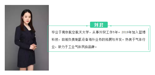 劉君:畢業(yè)于南京航空航天大學(xué),從事外貿(mào)工作5年。2019年加入藍博科技,目前負(fù)責(zé)制氫設(shè)備海外業(yè)務(wù)的拓展與開發(fā)。熱衷于氣體行業(yè),致力于工業(yè)氣體民族品牌。