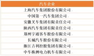 在汽車制造領域,一共有8家汽車公司,上海汽車集團股份有限公司、中國第一汽車集團公司、安徽叉車集團有限責任公司、陜西汽車集團有限責任公司、鄭州宇通客車股份有限公司、長城汽車股份有限公司、浙江吉利控股集團有限公司、中車株洲電力機車有限公司。