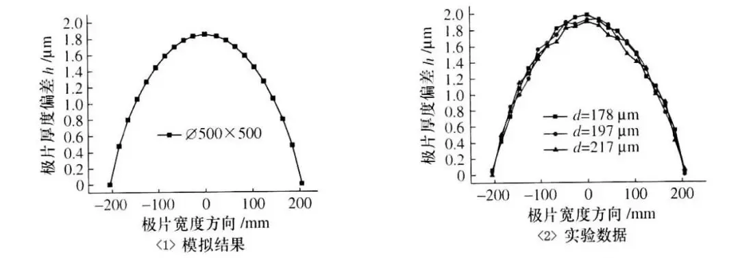 沿極片寬度方向,實驗數據和模擬數據變化趨勢大體一致,沿極片寬度方向,邊部位置厚度偏差值較小,而在中部位置偏差值達到最大。如圖4。