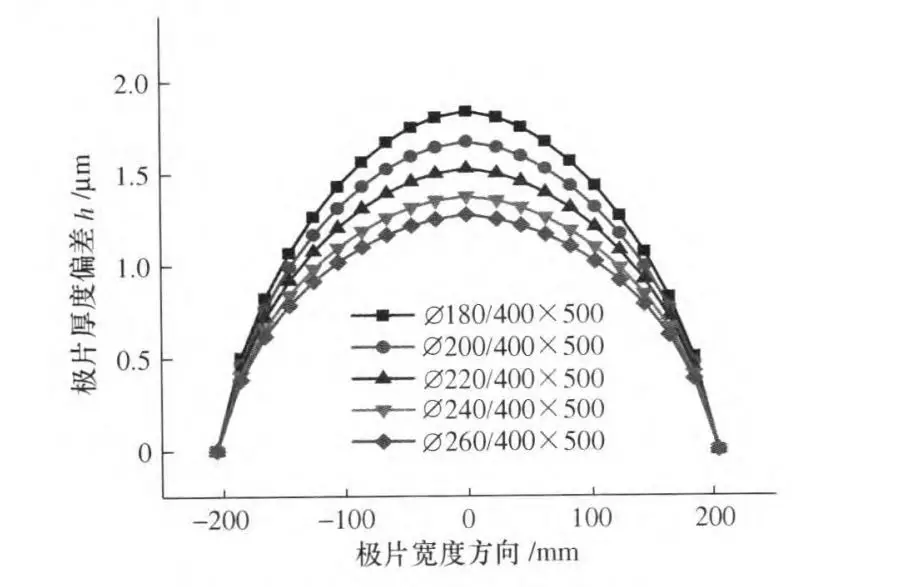 隨著工作輥直徑的增加,總體極片厚度偏差逐漸減小,沿極片寬度方向的中間位置厚度偏差減小較為明顯,而在極片兩側厚度偏差減少不明顯,如圖5。