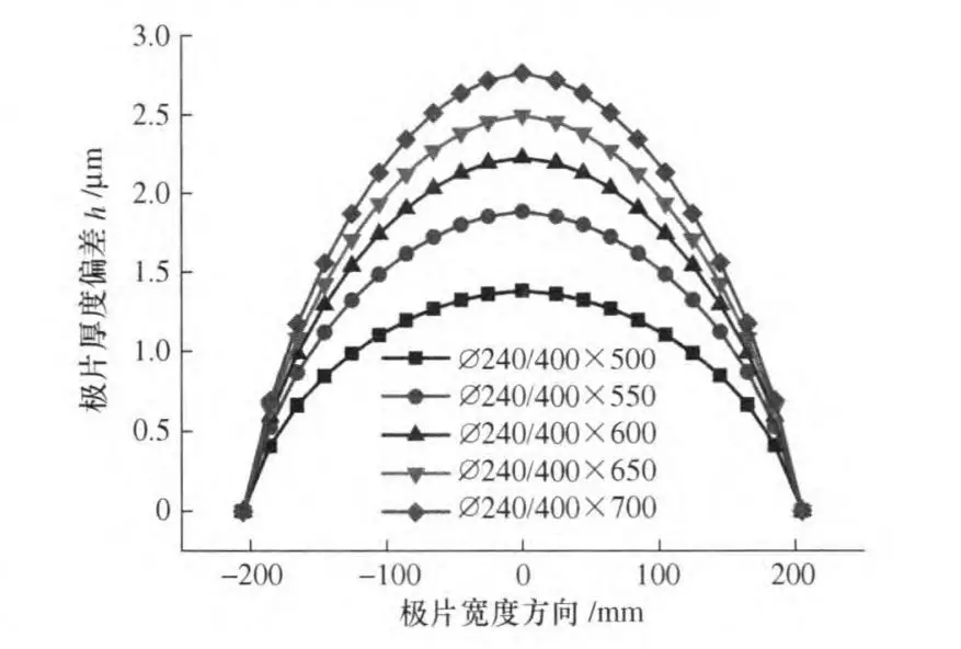 由于單位輥壓力的不均勻,導致極片沿寬度方向的壓下量不一致。若不考慮極片在輥壓后的反彈,可以認為極片的斷面形狀和工作輥有載輥縫的形狀相同。一定范圍內,軋輥撓曲變形越大,極片厚度一致性越差。