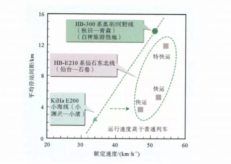 對于快運服務,HB-E210系列車的平均停站間距與既有混合動力列車KiHa E200相似。對于特快運輸,HB-E210系列車的平均停站間距與HB-E300相似。