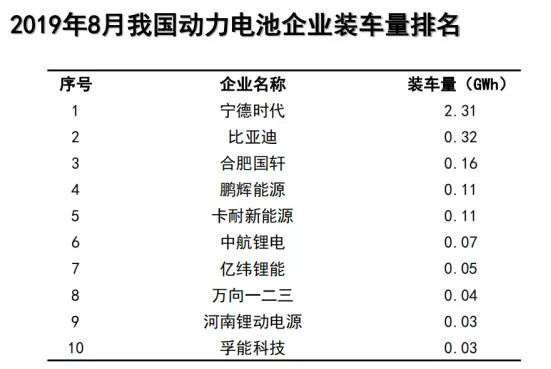 2019年8月,我國新能源汽車市場共計44家動力電池企業(yè)實現(xiàn)裝車配套,較7月份減少3家。排名前3家、前5家、前10家動力電池企業(yè)動力電池裝車量分別為2.8GWh、3.0GWh和3.2GWh,占總裝車量比分別為80.8%、87.1%和93.9%。