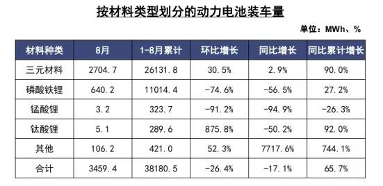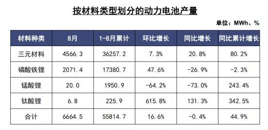 1-8月,我國動力電池產(chǎn)量累計55.8GWh,同比累計增長44.9%。其中三元電池產(chǎn)量累計36.3GWh,占總產(chǎn)量65.0%,同比累計增長80.2%;磷酸鐵鋰電池產(chǎn)量累計17.4GWh,占總產(chǎn)量31.1%,同比累計下降2.3%。
