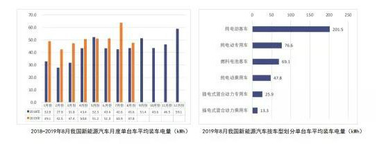 2019年8月,受新能源客車產(chǎn)量下降影響,我國新能源汽車按車型劃分的平均裝車電量47.8kWh,環(huán)比下降25.2%。