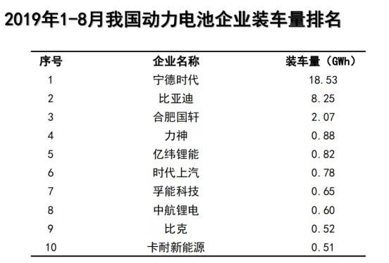 2019年1-8月,我國新能源汽車市場共計71家動力電池企業(yè)實現(xiàn)裝車配套,排名前3家、前5家、前10家動力電池企業(yè)動力電池裝車量分別為28.9GWh、30.6GWh和33.6GWh,占總裝車量比分別為75.6%、80.1%和88.1%。