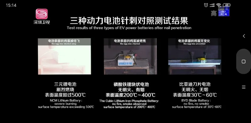 王傳福介紹,刀片電池具有高安全、長壽命、長續(xù)航的優(yōu)勢,是比亞迪基于磷鐵酸鋰技術的又一次創(chuàng)新。其體積能量密度與主流三元鋰電池持平,在相同體積下所儲存的電量也相差無幾,但安全性表現(xiàn)卻遠遠超出三元鋰電池。在針刺試驗中,刀片電池針刺點附近位置僅有較低程度的溫升變化,基本杜絕了出現(xiàn)燃爆的可能。