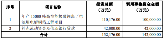 該項(xiàng)目的實(shí)施主體是青海諾德新材料有限公司,建設(shè)內(nèi)容是擬建成年產(chǎn)15000噸高性能極薄鋰離子電池用電解銅箔生產(chǎn)線,建設(shè)期2年。該項(xiàng)目計(jì)劃總投資11.02億元,主要包括建筑工程費(fèi)、設(shè)備購置費(fèi)、安裝工程費(fèi)以及其他費(fèi)用、預(yù)備費(fèi)和鋪底流動(dòng)資金等用途;其中,擬使用募集資金投入10億元。