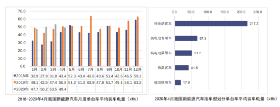 從單臺車平均裝車電量來看,2020年4月,我國新能源汽車按車型劃分的平均裝車電量49.4kWh,環(huán)比下降7.6%。其中純電動客車單車平均帶電量217.2kWh/輛,純電動專用車平均帶電量為67.3kWh/輛,純電動乘用車平均帶電量為51.2kWh/輛。