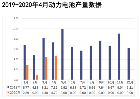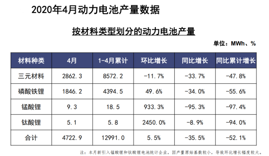 此外,2020年1-4月,我國三元電池產量累計為8.6GWh,占總產量66.0%,同比累計下降47.8%;磷酸鐵鋰電池產量累計為4.4GWh,占總產量33.8%,同比累計下降55.6%。