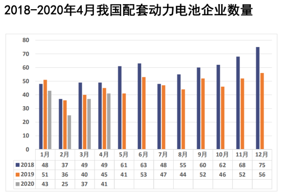 實現裝車配套方面,2020年4月,我國新能源汽車市場共計41家動力電池企業(yè)實現裝車配套,較3月份增加了4家,較2019年4月減少了4家,較2018年4月減少了8家。