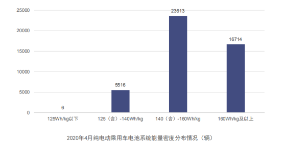 從電池系統(tǒng)能量密度分布來看,2020年4月,我國純電動乘用車系統(tǒng)能量密度在125(含)-140Wh/kg車型產量占純電動乘用車總產量比例12.0%,較3月份提升4.5個百分點,140(含)-160Wh/kg和160Wh/kg及以上車型產量占比分別為51.5%和36.5%。