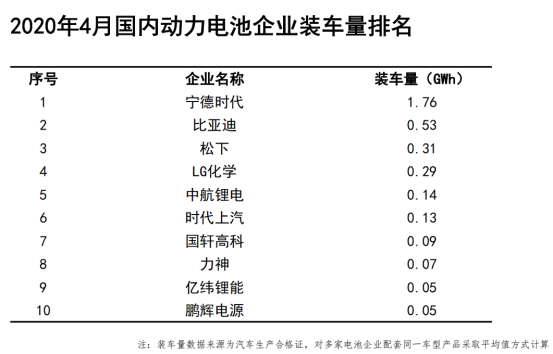 此外,2020年1-4月,我國動力電池裝車量排名前十的企業(yè)分別是寧德時代、比亞迪、松下、LG化學、國軒高科、中航鋰電、億緯鋰能、力神電池、時代上汽、塔菲爾新能源。