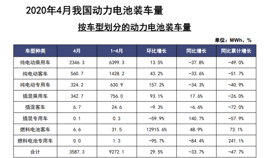 從配套車型來看,2020年4月,我國純電動乘用車動力電池裝車量為2346.3MWh,環(huán)比增長13.5%,同比減少37.8%;純電動客車裝車量為560.7MWh,環(huán)比增長43.2%,同比減少33.6%;純電動專用車動力電池裝車量為324.2MWh,環(huán)比增長157.2%,同比減少34.3%。