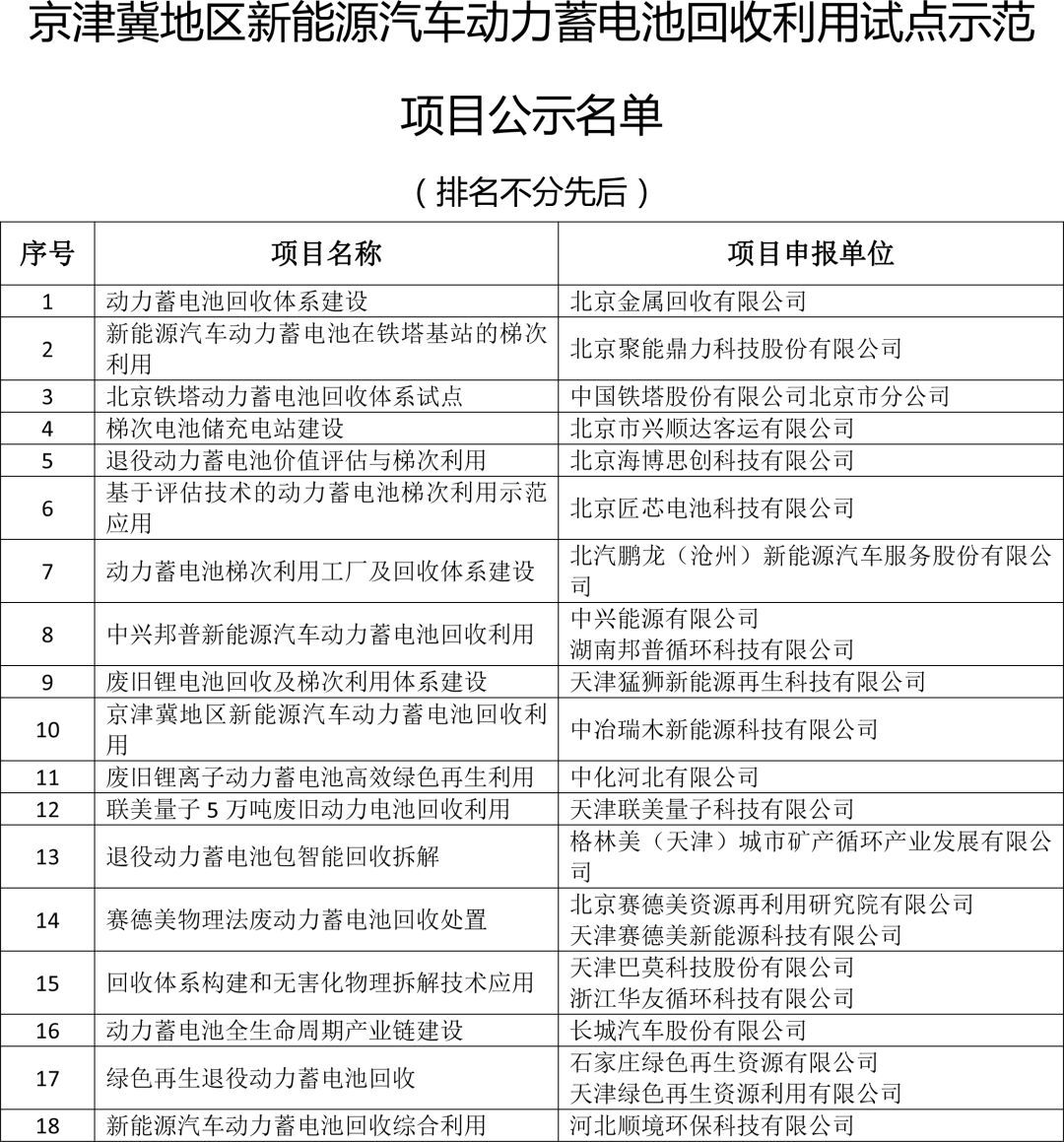 2019年6月14日,北京市經(jīng)濟和信息化局發(fā)布了《關(guān)于京津冀地區(qū)新能源汽車動力電池回收利用試點示范項目》的公示,共包含21家申報單位申報的18個試點示范項目,其中包含中國鐵塔北京分公司的“北京鐵塔動力蓄電池回收體系試點”、北京市興順達客運有限公司的“梯次電池儲充電站建設(shè)”、北京匠芯電池科技有限公司的“基于評估技術(shù)的動力蓄電池梯次利用示范應(yīng)用”等。