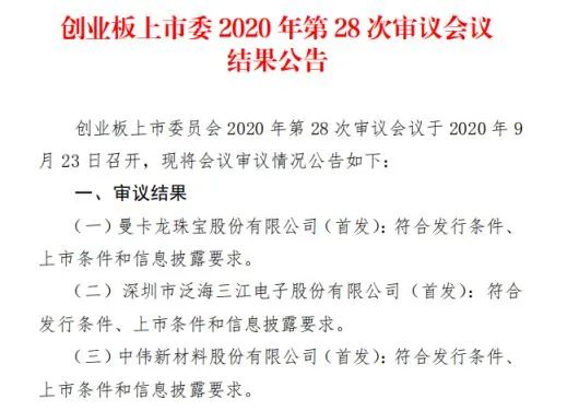 9月23日晚,創(chuàng)業(yè)板上市委發(fā)布2020年第28次審議會議結(jié)果公告,中偉新材料股份有限公司(以下簡稱:中偉股份)IPO成功過會。