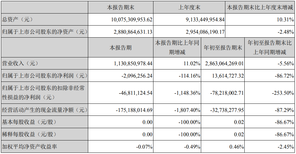 公告顯示,第三季度,多氟多營業收入11.31億元,同比增長11.02%;歸屬于上市公司股東的凈利潤-209.63萬元,同比下降114.16%。