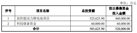 電池項目總投資額約52.56億元,擬以募集資金投入金額46億元;科技儲備資金總投資額約6億元,擬全部以募集資金投入。