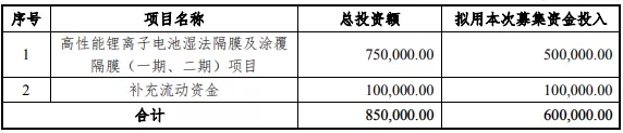 電池濕法隔膜及涂覆隔膜(一期、二期)項目和補充流動資金。