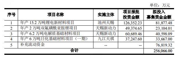 年產6.2萬噸電解質基礎材料項目產品規模6萬噸/年FSI、2000噸/年TMSP,項目實施單位九江天賜新動力材料科技有限公司,建設周期15個月,建設地點江西省九江市湖口縣金砂灣工業區,投資金額總投資額6.07億元,其中擬投入募集資金金額4.06億元,預計項目投資稅后投資回收期4.10年(含建設期)。