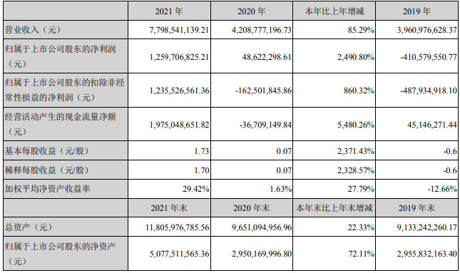 3月21日晚,多氟多發布2021年年度報告,報告期內,公司密切關注國家政策導向,更加聚焦發展新材料業務,全年實現營業總收入77.99億元,同比增加85.29%;歸屬于上市公司股東的凈利潤12.60億元,同比增加2490.8%。