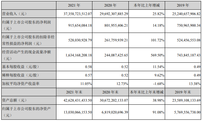 4月12日晚間,欣旺達發布2021年年度報告,報告期內,公司實現營業收入373.59億元,同比增長25.82%;實現歸屬于上市公司股東的凈利潤9.16億元,同比增長14.18%。
