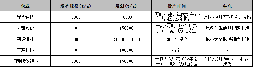國內企業在磷酸鐵鋰再生利用項目方面已有布局,未來將有更多的磷酸鐵鋰再生利用項目投入運營。布局企業主要分兩類:一類是贛鋒鋰業、順華鋰業等已具備一定磷酸鐵鋰再生利用產能,積累了直接項目經驗的企業;另一類具備相關回收經驗和渠道,計劃開拓磷酸鐵鋰再生利用業務,如天奇股份、天賜材料。其中,天奇股份表示,已儲備專業技術團隊,并已攻克磷酸鐵鋰電池回收處理及規模化生產的技術難題,投資建設廢舊磷酸鐵鋰電池處理項目勢在必行。實際上,由于磷酸鐵鋰再生利用項目的最終收益是一個綜合性考量,包括鋰價情況、碳酸鋰的回收率、產品品質穩定性以及電池級磷酸鐵產出情況等,企業傾向于分期實施項目或先做短期規劃,視市場發展的具體情況再進一步規劃。