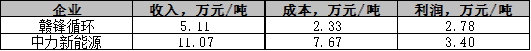 注:贛鋒循環項目收入、成本、利潤以單噸廢舊磷酸鐵鋰電池為單位,中力新能源項目收入、成本、利潤以單噸磷酸鐵鋰廢粉為單位。