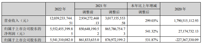 3月6日晚,盛新鋰能披露2022年年報。2022年,公司實現營業收入120.39億元,同比增長299.03%;凈利潤55.52億元,分別增長541.32%。報告期內,公司主要業務為鋰礦采選、基礎鋰鹽和金屬鋰產品的生產與銷售。