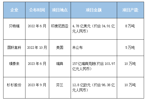 電池市場需求的增長,看好該機遇,國內企業積極擴大相關產能。近日,杉杉股份宣布下屬子公司上海杉杉鋰電材料科技有限公司在芬蘭設立項目公司并投資建設年產10萬噸鋰離子