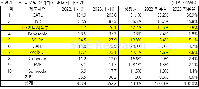韓系動力電池三大巨頭的市占率同比下降1.1個百分點至23.4%,但三家公司的裝車量均實現增長。LG新能源同比增長47.2%,為76.1GWh,居全球第3;SK On同比增長13.8%,為27.9GWh,排名第5;三星SDI同比增長42.1%,為25.1GWh,排名第7。