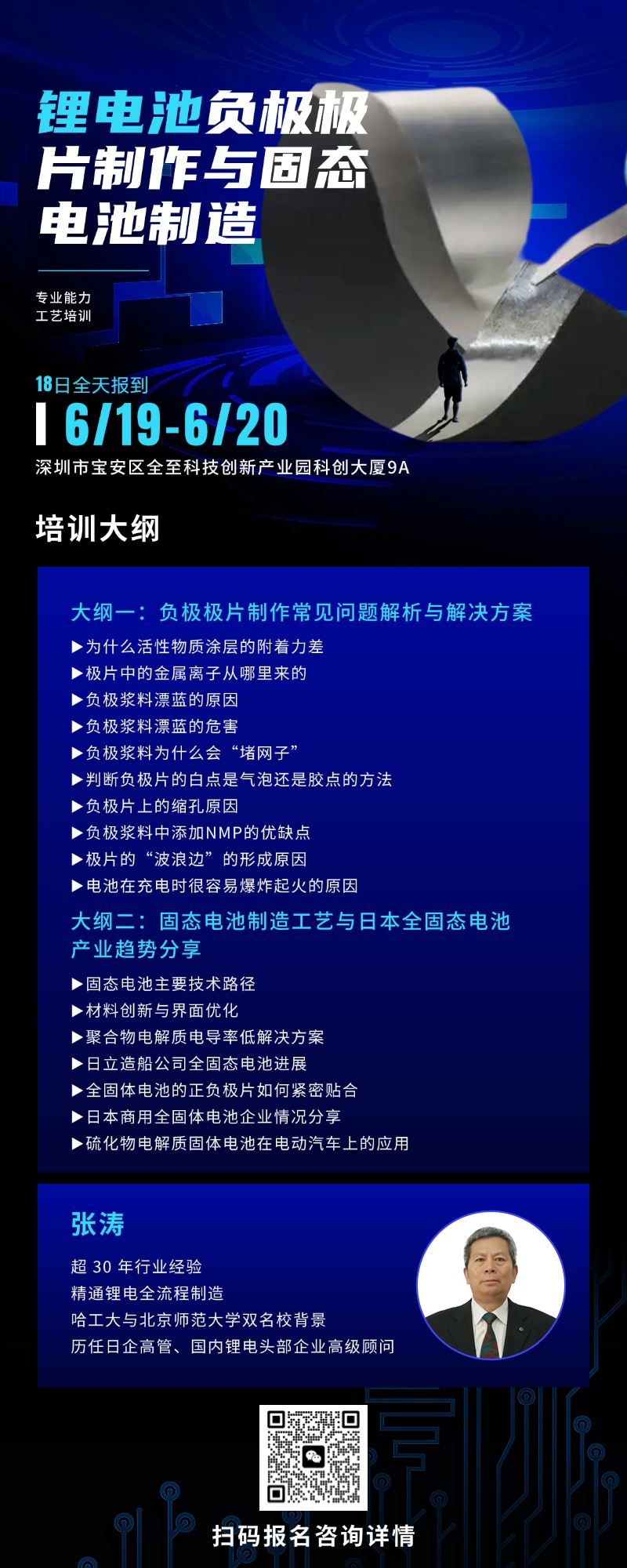 為了更好的助力鋰電池制造工藝優化與技術創新,從負極極片高頻缺陷切入,結合案例解析工藝優化路徑,應廣大會員的要求,北京綠色智匯能源技術研究院、深圳市新能源汽車促進會于6月19-20日召開鋰電池負極極片制作與固態電池制造工藝培訓。內容如下: