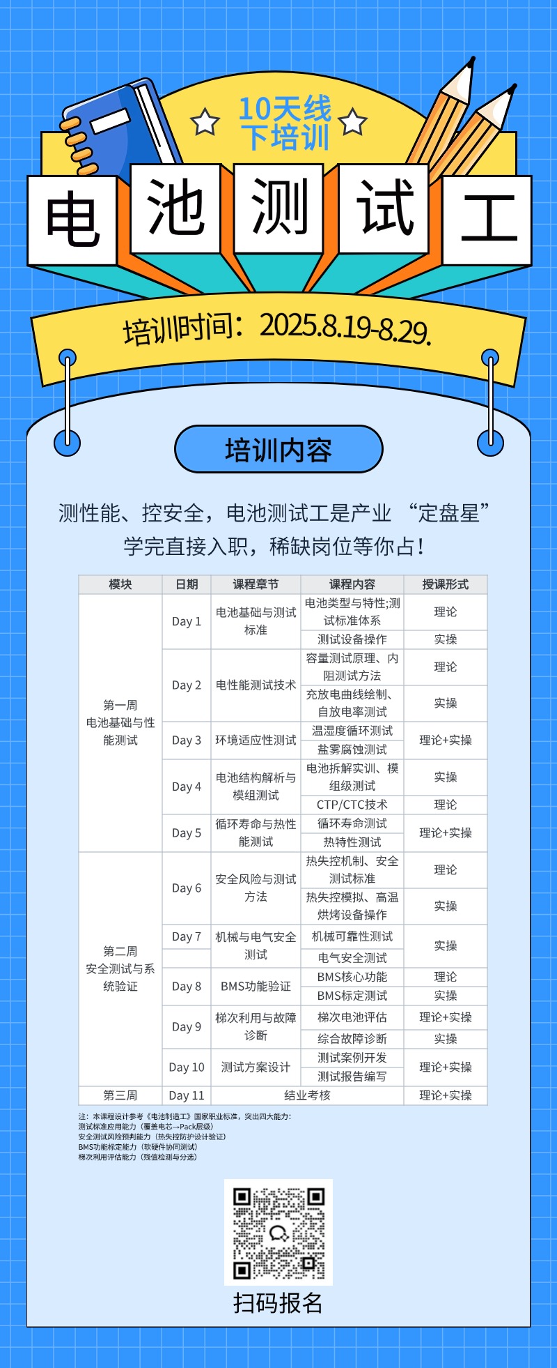 為解決這一行業痛點,由深圳市新能源汽車促進會、北京綠色智匯能源技術研究院聯合主辦的 “電池測試工崗位專班” 將于 8 月 19 日在深圳開班。只需 10 天線下強化實訓,考核合格后直接安排上崗,讓你快速踏入新能源行業的 “黃金賽道”。
