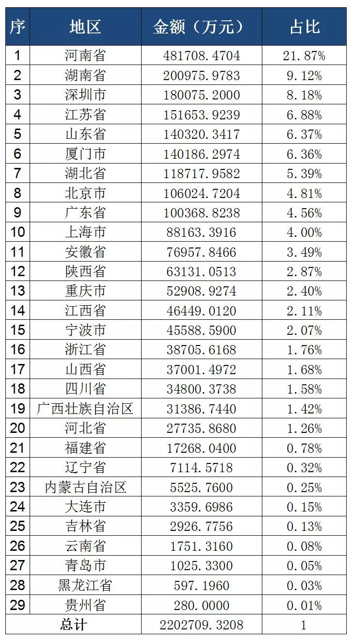 補貼領取排名前三的地區分別是河南省、湖南省、深圳市。其中,宇通客車“貢獻”了河南省約95%的補助金,達458574萬元;湖南中車時代貢獻了湖南省約68%的補助金,為136251萬元;比亞迪則貢獻了深圳市約99%的補助金,將收獲178575萬元。