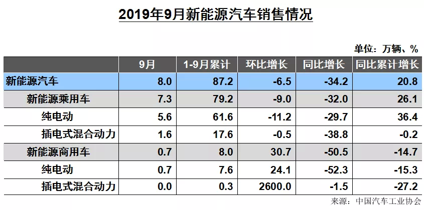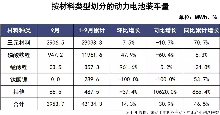 從大的產業層面看亦是如此。2019年9月,國內新能源汽車產銷總數分別是8.9萬輛和8萬輛,同比下降29.9%和34.2%。同期的動力電池裝車量也同比下降了30.9%,其中,三元材料電池同比下降10.7%,磷酸鐵鋰同比下降60.4%,鈦酸鋰則同比下降100%。