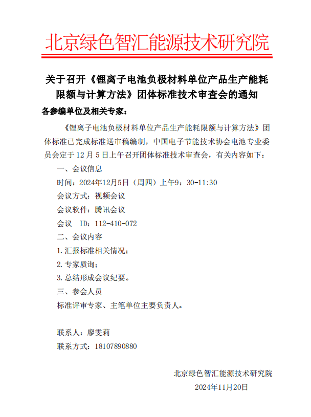 《鋰離子電池負極材料單位產品生產能耗限額與計算方法》團體標準已完成標準送審稿編制,中國電子節能技術協會電池專業委員會定于12月5日上午召開團體標準技術審查會,有關內容如下: