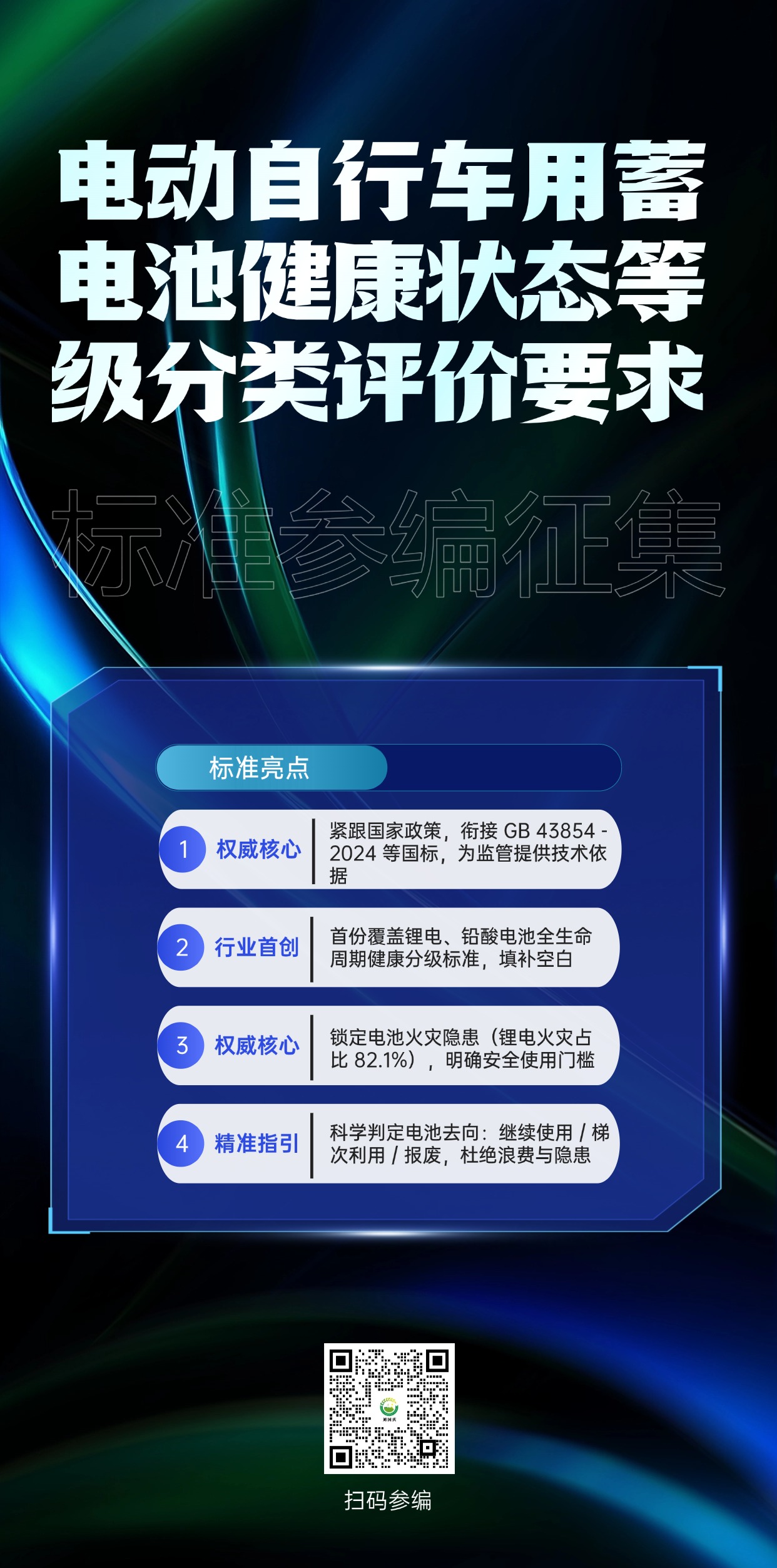 誠邀各相關(guān)單位積極參與兩項標準的編制工作,共同完善電動自行車蓄電池健康管理與評估網(wǎng)點運營的標準體系,助力行業(yè)安全規(guī)范發(fā)展。