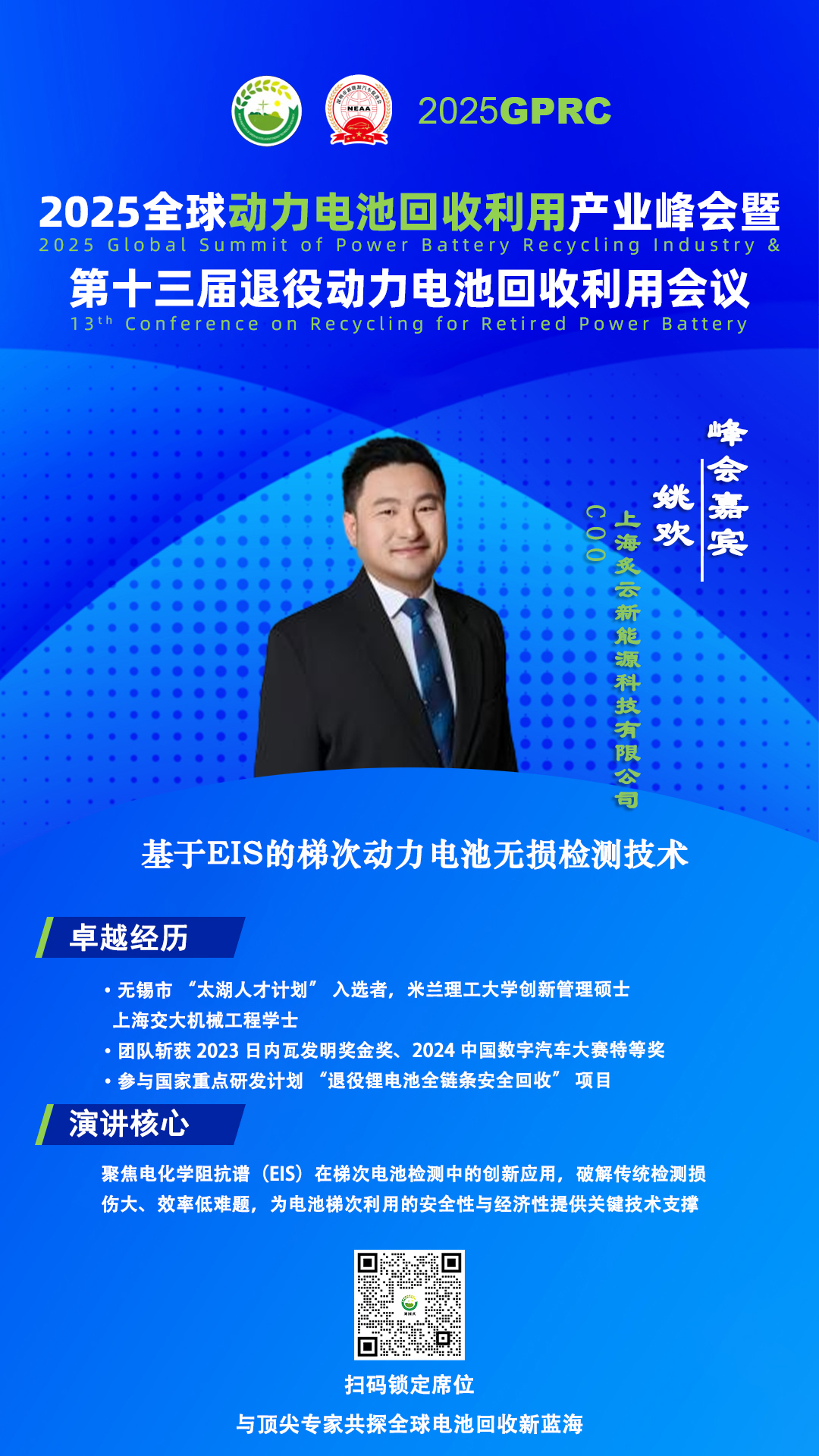 8 月 30 日,2025 全球動力電池回收利用產業峰會暨第十三屆退役動力電池回收利用會議上,上海炙云新能源科技有限公司 COO 姚歡將發表 “基于 EIS 的梯次動力電池無損檢測技術” 的主題演講。