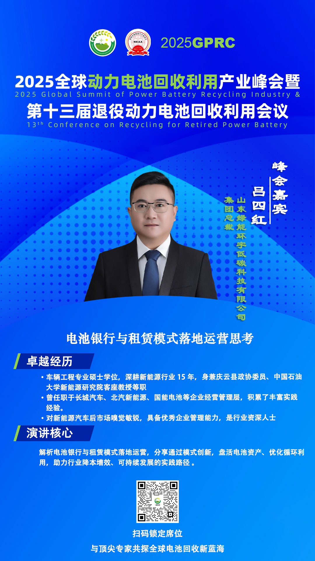 8 月 30 日,2025 全球動力電池回收利用產(chǎn)業(yè)峰會暨第十三屆退役動力電池回收利用會議上,山東綠能環(huán)宇低碳科技有限公司集團總裁呂總將發(fā)表 “電池銀行與租賃模式落地運營思考” 的主題演講。