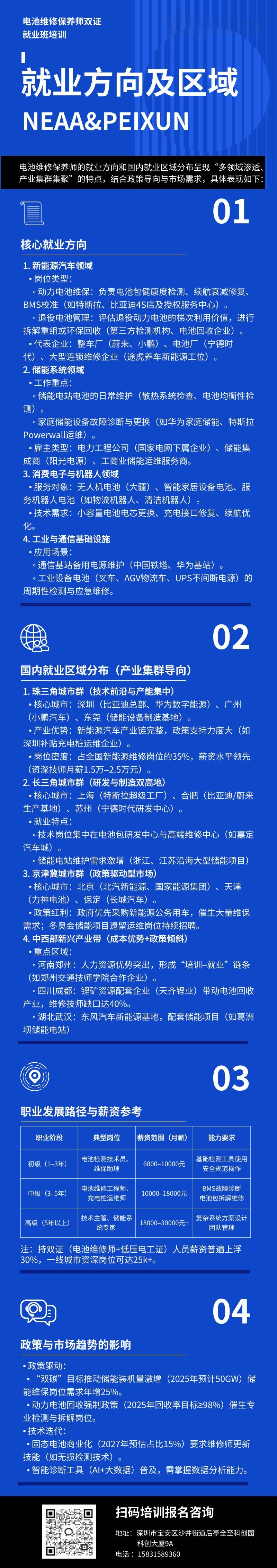 隨著新能源汽車保有量突破 2472 萬(wàn)輛,動(dòng)力電池售后維保市場(chǎng)迎來(lái)爆發(fā)期,預(yù)計(jì) 2025 年市場(chǎng)規(guī)模將達(dá) 3000 億元。然而,行業(yè)面臨嚴(yán)峻的人才缺口 據(jù)工信部數(shù)據(jù),新能源汽車維修領(lǐng)域人才空白高達(dá) 80%。為填補(bǔ)技能缺口, 電池維修保養(yǎng)師雙證就業(yè)班 正式啟動(dòng)報(bào)名,