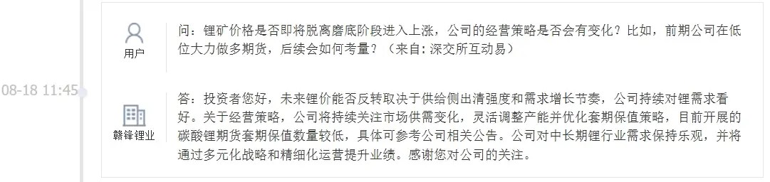 贛鋒鋰業(yè)在互動(dòng)平臺(tái)上表示,未來(lái)鋰價(jià)能否反轉(zhuǎn)取決于供給側(cè)出清強(qiáng)度和需求增長(zhǎng)節(jié)奏,公司持續(xù)對(duì)鋰需求看好。