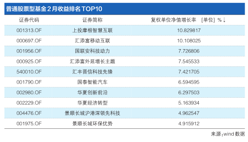 2月的普通股票型基金排名前十中,上投摩根智慧互聯和匯添富移動互聯兩只基金收益率以10.83%和10.11%奪得2月冠亞軍。前十的基金無一例外,全部重倉制造業,并主要集中于鋰鈷和光電行業。且除了景順長城滬港深領先科技外,所有基金投資制造業占基金凈值的比例均在50%以上。高頻率出現在這10只基金中的股票有6只,具體包括華燦光電、贛鋒鋰業、華友鈷業、歐菲科技、天齊鋰業和大華股份。華燦光電2月漲幅為25.61%,而其余5只股票的漲幅正如前文所說,均在10%以上。